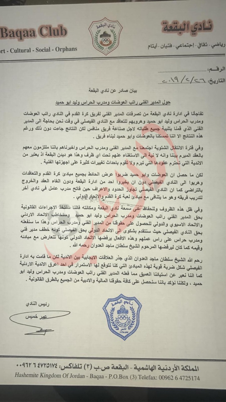 انتشر مقطع فيديو مؤثر للمدرب الأردني راتب العوضات، المدير الفني السابق للنادي الفيصلي. لا يليق بك إلا الابتسامة يا أيها الحبيب، راتب يا أجمل سنوات المنتخب، راتب يا فخر. .فراس شلباية صالح راتب * احمد الياس فهد اليوسف * احمد سمير * انس العوضات انداي المدير الفني يوسف ابو جلبوش صيصا * مهدي علامة محمد العكش المدير الفني راتب العوضات. تعيين العوضات مدربا لفريق الفيصلي. ظهر المدير الفني السابق لنادي الفيصلي راتب العوضات في مقطع يدعو فيه السلطات والشعب الأردني لمساعدته في العلاج من مرض السرطان.